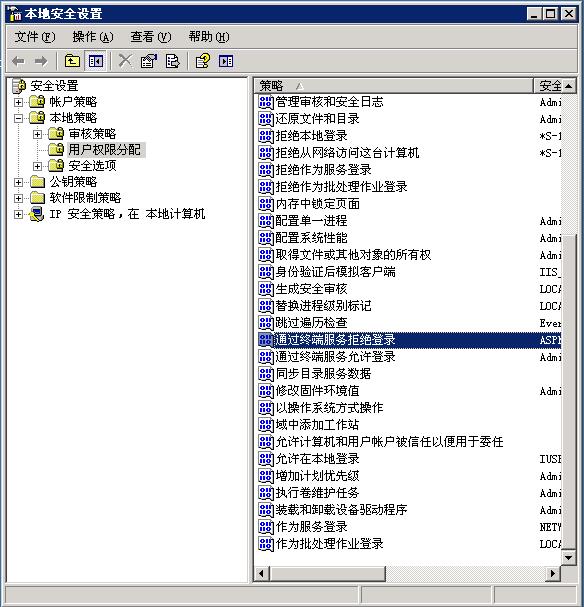 安全策略-->本地策略-->用戶權限分配-->通過終端服務拒絕登錄,在里面添加想要禁止遠程的用戶可以達到讓這個賬戶無法遠程